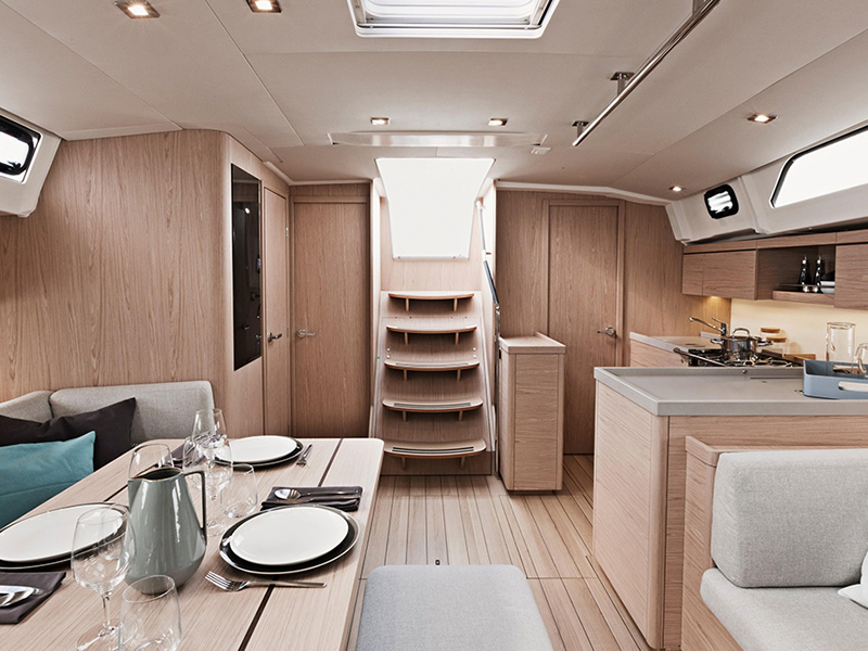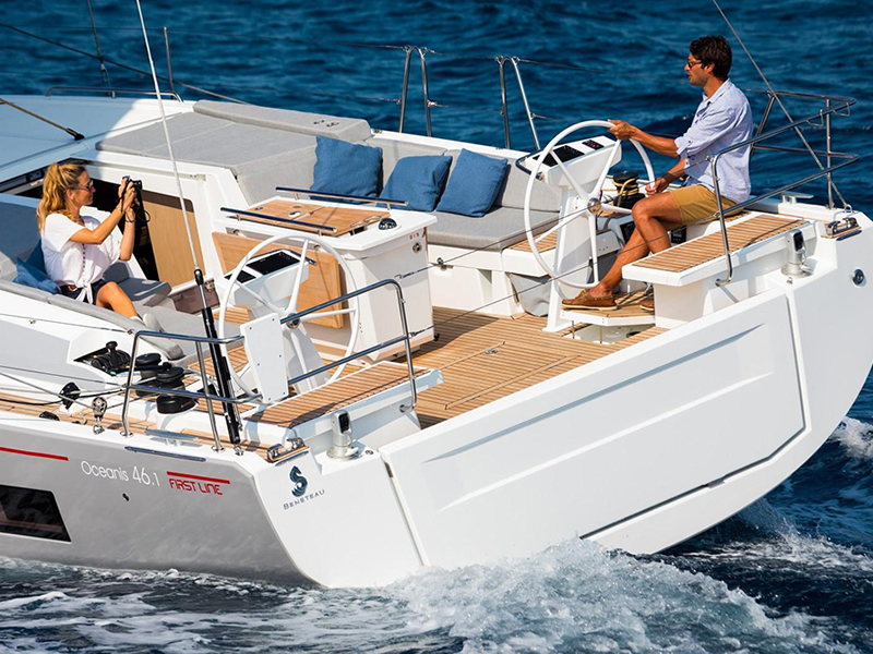 The Beneteau Ocenais 46.1 is again all about the cockpit. The side seating areas comfortably accommodates uptown 10 guests with plenty of lounging and seating areas… The teak cockpit table with side opens becomes a massive table for dining or socialising… The cockpit houses twin helms both equipped with the navigation instruments and electronics. One of the best thing about Beneteau s cockpit is the swim platform which when lowered almost doubles the size of the cockpit area… This design unique to Beneteau gives these sailing yachts a huge area at the cockpit where 8 or more guests have plenty of space to sunbathe/swim and play...