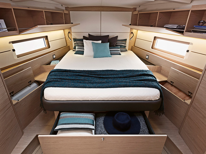 Our Beneteau Oceanis 46.1 is the 4 cabin version. The two staterooms forward on starboard and port has a double size beds and separate shower room and electric flush WC. There are plenty of storage units and cabinets and the cabin is equipped with USB ports for your convenience… The two aft cabins again with double beds again both ensuite with a separate shower room and electric flush WC. Again the aft cabins has plenty of storage space and are equipped with USB ports.